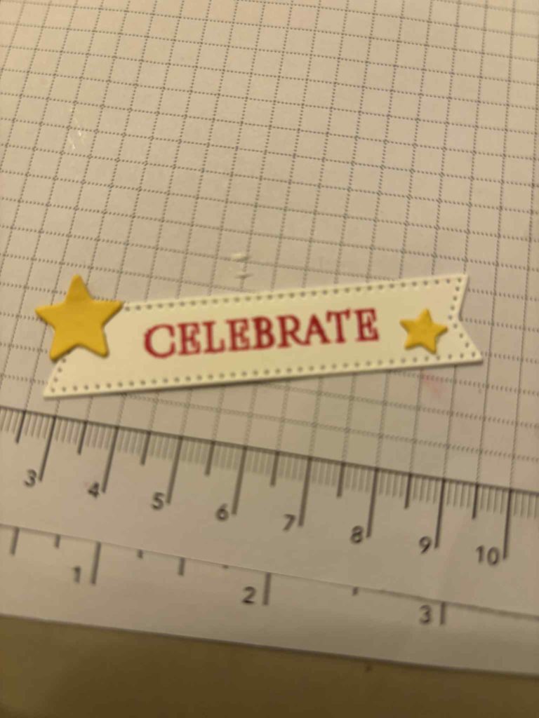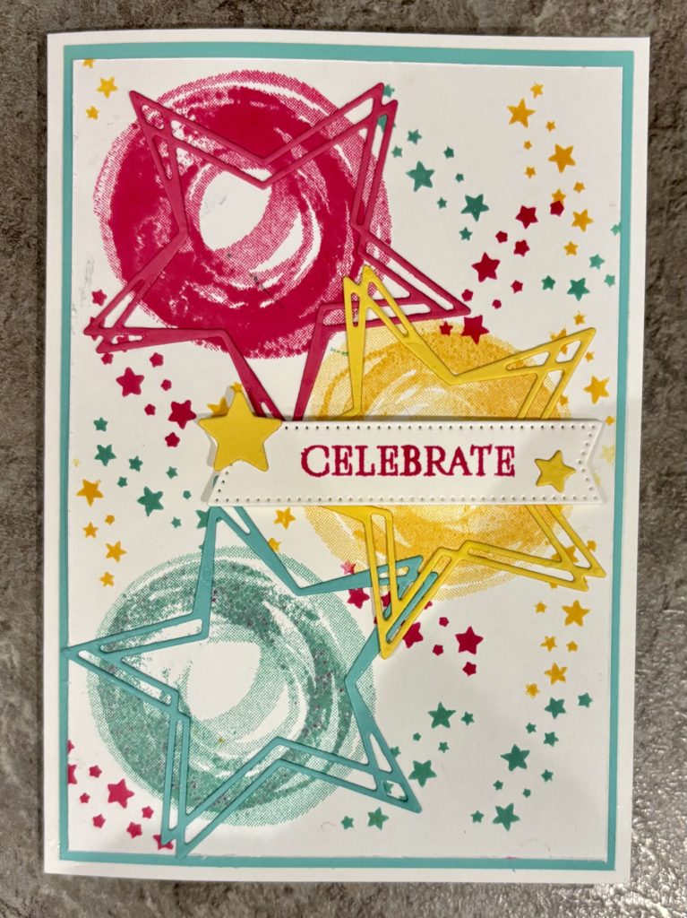 Glue the card layer onto the mat layer and then stick that onto the card base. Die cut or trim a sentiment strip and stamp your greeting. I cut some extra small stars from the yellow card and stuck those on.
