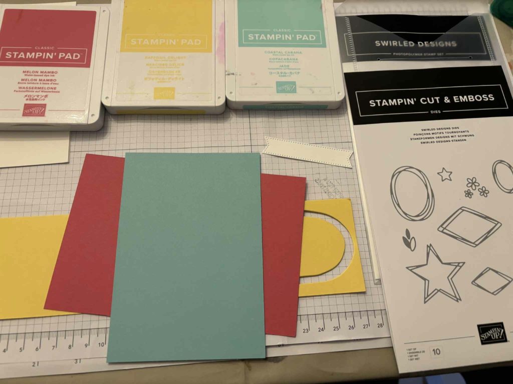 - Inks Coastal Cabana, Melon Mambo, Daffodil Delight, card scraps in the same 3 colours Swirled Designs Bundle, Stampin’ Cut n Emboss machine, paper trimmer, multipurpose adhesive.