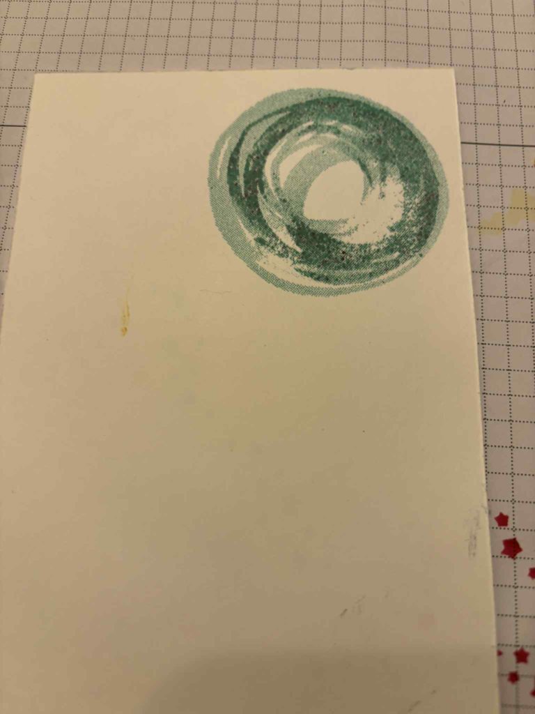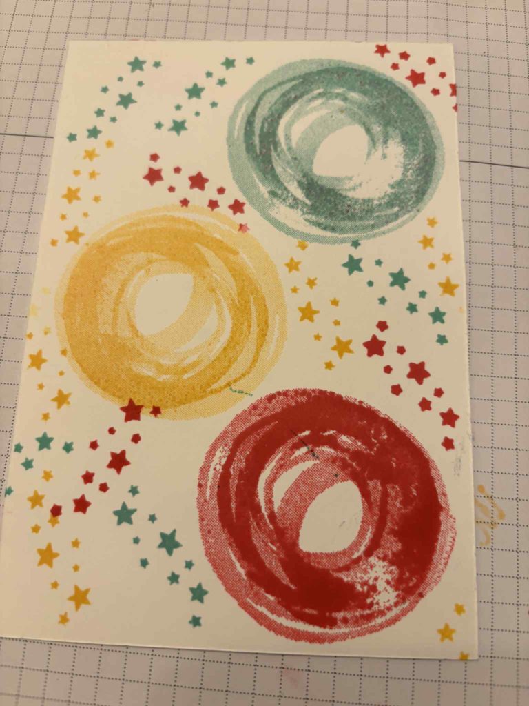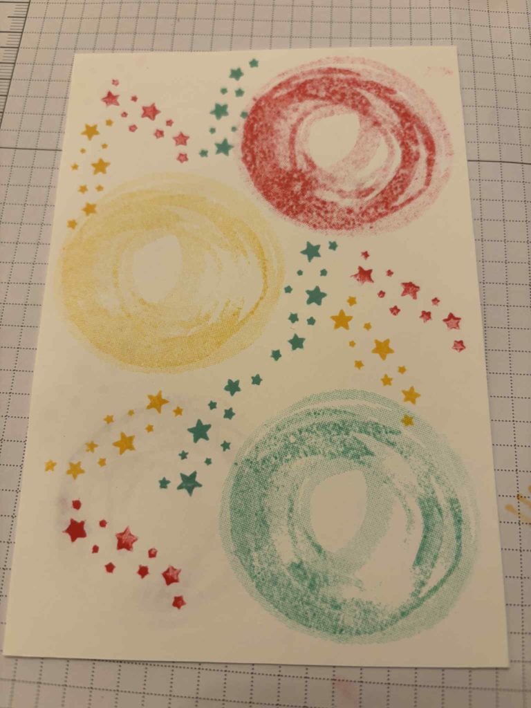 Use the swirly circle stamp to stamp onto the white stamping layer with your 3 ink colours. I have included 2 examples. The first and second generation stamping results. You can see that the stamped off version gives a softer colour. I then added star showers using the same inks.