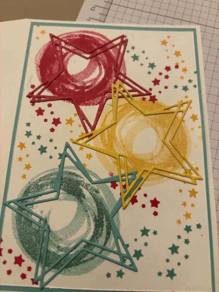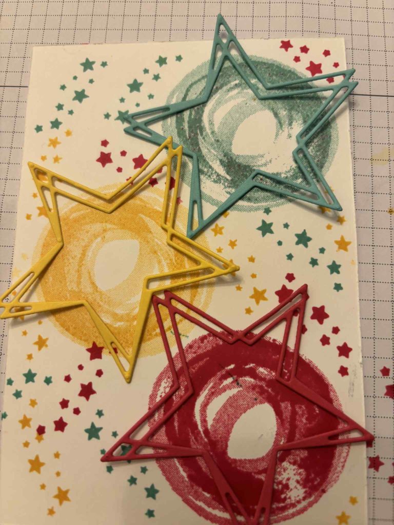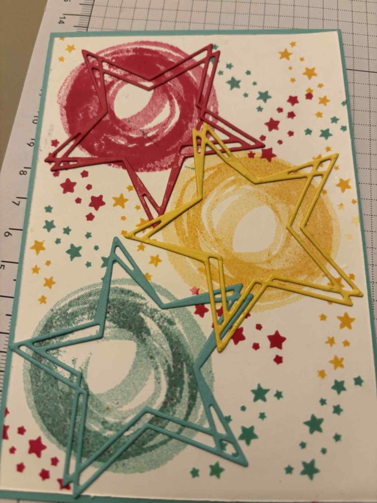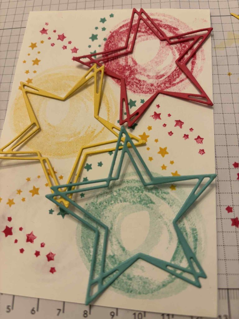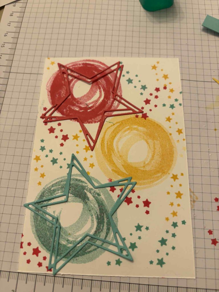 Next, die cut your star shapes out of scraps in the same 3 colours. My intention was to use adhesive paper that I just needed to peel off but as ever I forgot! I only ever remember as I am carefully trying to put multipurpose adhesive onto the fiddly bits. These 2 pictures show the stars on the 2 different backgrounds. I decided to go with the version on the left below.