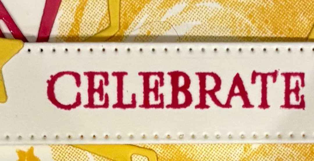 Glue the card layer onto the mat layer and then stick that onto the card base. Die cut or trim a sentiment strip and stamp your greeting. I cut some extra small stars from the yellow card and stuck those on.