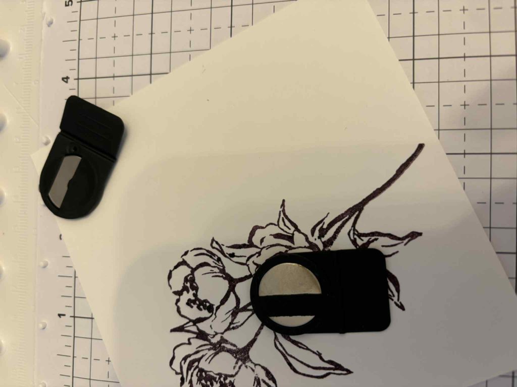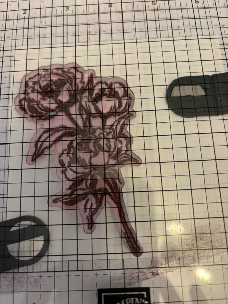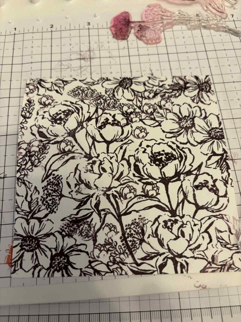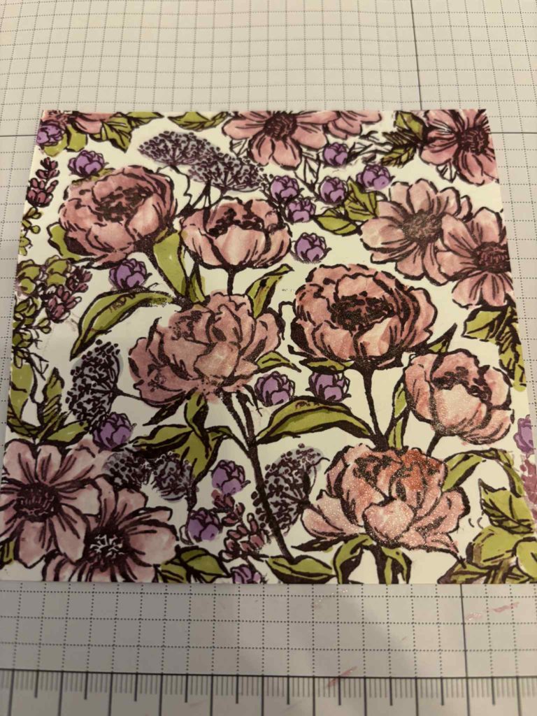 Use the position tool to stamp your main images with Blackberry Bliss onto the white card square. Use the additional flower images to fill in the gaps.