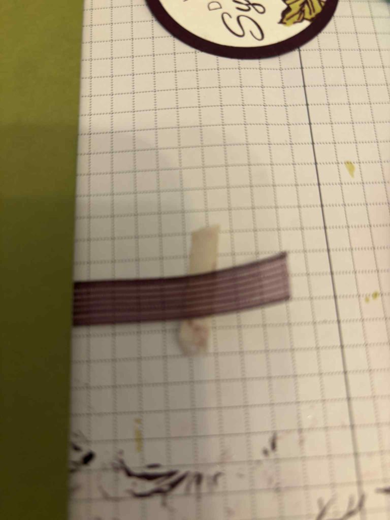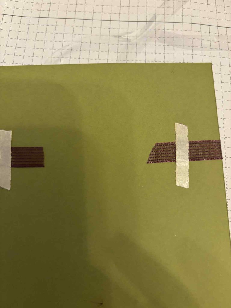 I used a piece of retired ribbon and attached 2 pieces of Tear n Tape to the ends. I used the lines on my grid paper to line it up evenly. I didn’t need to remove the top layer of the tape because I was using All Purpose Adhesive to stick the card square down. Once it was fixed, I added a shorter piece of ribbon so that it looked like a bow.