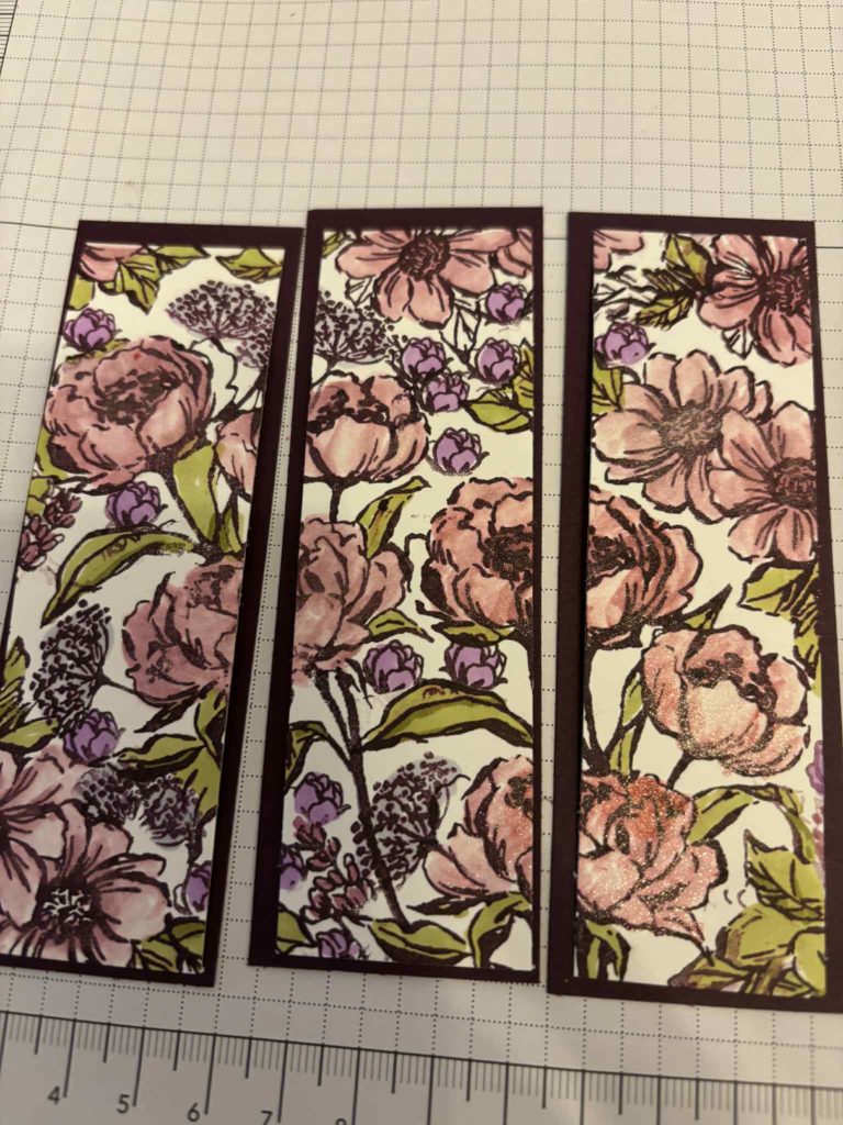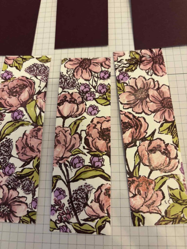 Once I had finished colouring I cut the stamped piece into 3.5cm strips and mounted them onto 4cm strips of Blackberry Bliss card. I mounted the 3 strips onto the Old Olive square, keeping the pattern sequence in the correct order.